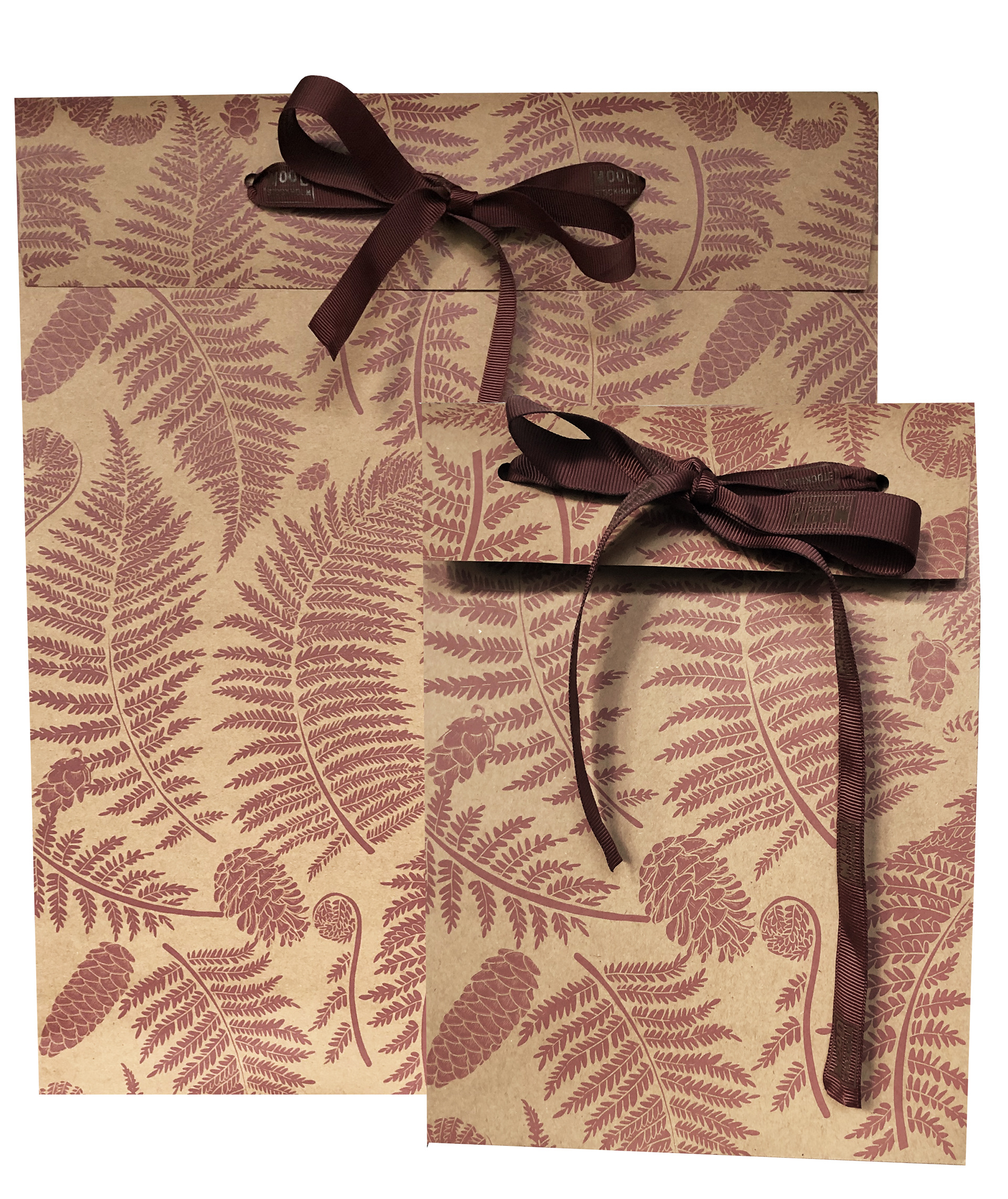 A print made during the Dekoform time for a client and their christmas gift bags that was printed and produced in raw eco paper with chocolate brown print and satin ribbons